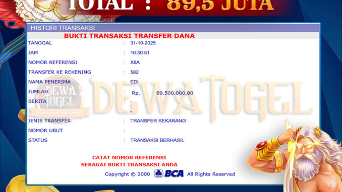 DEWATOGEL mengucapkan selamat kepada user id : DTG*** yang telah berhasil mendapatkan jackpot pada permainan SLOT DI STARLIGHT PRINCESS. Kemenangan sebesar Rp 89.500.000,-. telah dibayarkan LUNAS oleh pihak dewatogel kepada pemilik user id setelah yang bersangkutan mengisi formulir withdraw. Proses pencairan dana berlangsung sangat cepat hanya dalam waktu 5-10 menit sudah berada dalam rekening pemilik user id. Bukti transfer yang dapat anda lihat adalah bukti SAH / VALID yang langsung di dapatkan melalui bukti transaksi dari Bank yang digunakan untuk pengiriman dana pada rekening pemilik user id. Terima kasih kami sampaikan kepada para pengguna setia DEWATOGEL yang telah menggunakan situs kami, sebagai Bandar Terpercaya yang pastinya membayar semua kemenangan member hingga lunas. Apakah DEWATOGEL PENIPU ? Reputasi “DEWATOGEL TERPERCAYA” sudah sangat melekat. puluhan hingga ratusan ribu pengguna setia DEWATOGEL tetap menggunakan situs terbesar dan terbaik di Indonesia ini. Hapus rasa was-was dan khawatir anda, kemenangan anda berapapun PASTI dibayarkan hingga lunas.