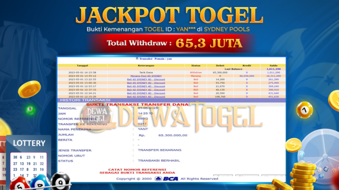 DEWATOGEL mengucapkan selamat kepada user id : YAN*** yang telah berhasil mendapatkan jackpot pada permainan TOGEL di SYDNEY 4D POOLS. Kemenangan sebesar Rp 65.300.000,-. telah dibayarkan LUNAS oleh pihak dewatogel kepada pemilik user id setelah yang bersangkutan mengisi formulir withdraw. Proses pencairan dana berlangsung sangat cepat hanya dalam waktu 5-10 menit sudah berada dalam rekening pemilik user id. Bukti transfer yang dapat anda lihat adalah bukti SAH / VALID yang langsung di dapatkan melalui bukti transaksi dari Bank yang digunakan untuk pengiriman dana pada rekening pemilik user id. Terima kasih kami sampaikan kepada para pengguna setia DEWATOGEL yang telah menggunakan situs kami, sebagai Bandar Terpercaya yang pastinya membayar semua kemenangan member hingga lunas. Apakah DEWATOGEL PENIPU ? Reputasi “DEWATOGEL TERPERCAYA” sudah sangat melekat. puluhan hingga ratusan ribu pengguna setia DEWATOGEL tetap menggunakan situs terbesar dan terbaik di Indonesia ini. Hapus rasa was-was dan khawatir anda, kemenangan anda berapapun PASTI dibayarkan hingga lunas.