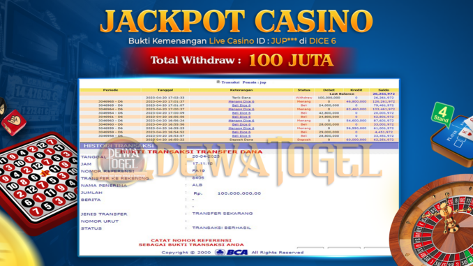 DEWATOGEL mengucapkan selamat kepada user id : JUP*** yang telah berhasil mendapatkan jackpot pada permainan LIVE CASINO DICE 6. Kemenangan sebesar Rp 100.000.000 ,-. telah dibayarkan LUNAS oleh pihak dewatogel kepada pemilik user id setelah yang bersangkutan mengisi formulir withdraw. Proses pencairan dana berlangsung sangat cepat hanya dalam waktu 5-10 menit sudah berada dalam rekening pemilik user id. Bukti transfer yang dapat anda lihat adalah bukti SAH / VALID yang langsung di dapatkan melalui bukti transaksi dari Bank yang digunakan untuk pengiriman dana pada rekening pemilik user id. Terima kasih kami sampaikan kepada para pengguna setia DEWATOGEL yang telah menggunakan situs kami, sebagai Bandar Terpercaya yang pastinya membayar semua kemenangan member hingga lunas. Apakah DEWATOGEL PENIPU ? Reputasi “DEWATOGEL TERPERCAYA” sudah sangat melekat. puluhan hingga ratusan ribu pengguna setia DEWATOGEL tetap menggunakan situs terbesar dan terbaik di Indonesia ini. Hapus rasa was-was dan khawatir anda, kemenangan anda berapapun PASTI dibayarkan hingga lunas.
